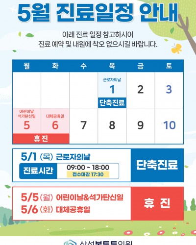 5월 진료일정 안내 안녕하세요! 삼성본튼튼의원입니다. 5월 진료 일정 안내드립니다. 5/1(목) 근로자의 날 : 단축진료 (18시까지) 5/5(월) 어린이날/부처님오신날 : 휴진 5/6(화) 대체공휴일 : 휴진 내..