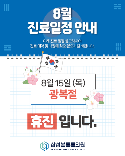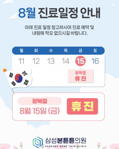 8월 진료일정 안내드립니다. 안녕하세요! 삼성본튼튼의원입니다. 8/15(목) 광복절은 휴진이오니 예약 및 내원에 참고 부탁드립니다. 감사합니다.