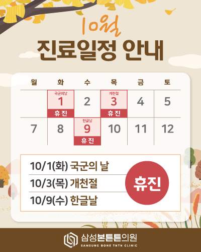 10월 진료일정 안내드립니다. 안녕하세요! 삼성본튼튼의원입니다. 10월 진료 일정 안내드립니다. 10/1(화) 국군의날 : 휴진 10/3(목) 개천절 : 휴진 10/9(수) 한글날 : 휴진 내원에 참고 부탁드립니다. 감..