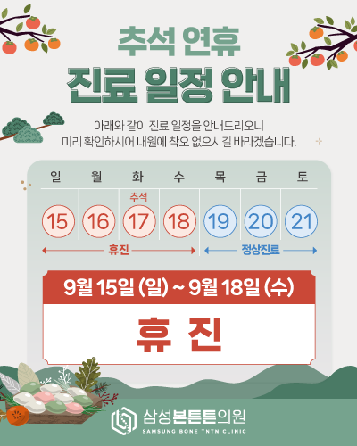 9월 진료일정 안내드립니다. 안녕하세요! 삼성본튼튼의원입니다. 9월 16일(월)~9월 18일(수) 추석 연휴 휴진입니다. 예약 및 내원에 참고 부탁드립니다. 감사합니다.