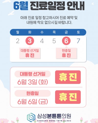 6월 진료일정 안내 안녕하세요! 삼성본튼튼의원입니다. 6월 진료 일정 안내드립니다. 6/3(화) 대통령 선거일 : 휴진 6/6(금) 현충일 : 휴진 내원에 참고 부탁드립니다. 감사합니다.